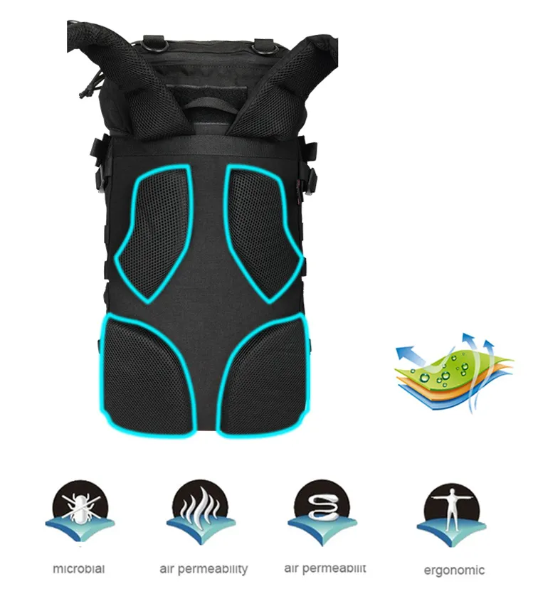 - Tela resistente al agua: Protege tu equipo de la lluvia ligera y la humedad.