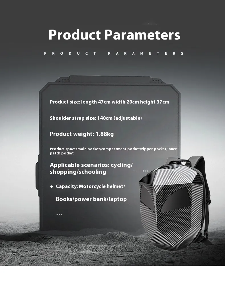 Mejora tu experiencia de conducción con la mochila impermeable y luminosa para casco de moto, diseñada específicamente para el caballero moderno sobre dos ruedas. Esta mochila para casco integral no solo ofrece una forma segura y cómoda de transportar tu casco, sino que también cuenta con un llamativo diseño luminoso que garantiza la visibilidad durante los viajes nocturnos. Fabricada con materiales impermeables de alta calidad, esta mochila protege tu casco de las inclemencias del tiempo, ya sea bajo la lluvia o conduciendo entre polvo y escombros. La mochila integral para casco Knight ofrece un amplio espacio de almacenamiento, con espacio no solo para tu casco, sino también para equipo adicional como guantes, gafas protectoras y artículos personales. El interior acolchado proporciona protección adicional para tu casco, asegurándote de que se mantenga sin rayones y en excelentes condiciones. Sus múltiples compartimentos y bolsillos permiten un almacenamiento organizado, facilitando el acceso a tus objetos esenciales cuando los necesitas. Diseñada para la comodidad y la practicidad, la mochila luminosa para casco de moto cuenta con correas ajustables que te permiten llevarla como mochila o bandolera, ofreciendo opciones versátiles de transporte. El panel posterior transpirable garantiza comodidad durante el uso prolongado, mientras que los elegantes detalles luminosos añaden un toque único a su equipo de conducción. Ya sea que estés viajando al trabajo, dando un paseo de fin de semana o recorriendo la carretera, la bolsa luminosa impermeable para casco de motocicleta es la compañera perfecta para todas tus aventuras.