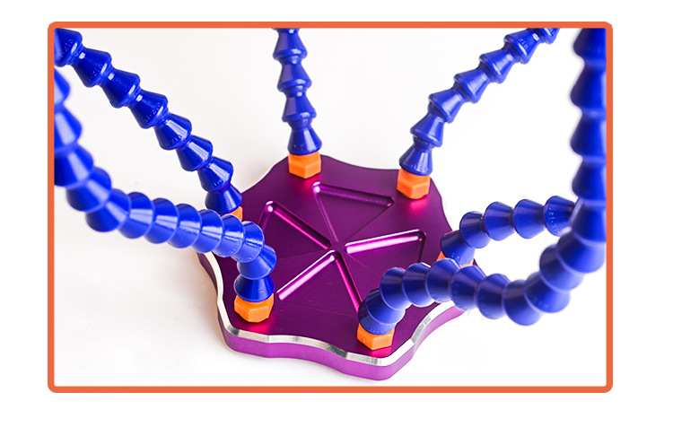 The bottom layer is non-slip, and the soldering station is aluminum, so it won't slip. Multi-function tool table, 6-arm multi-purpose, suitable for model aircraft plugs, flight control of flying aircraft, etc., can help you complete various complex welding. At the same time, the large piece of all-metal used in the bottom plate, only the bracket can be bent arbitrarily, which can be easily Clamp up any object waiting to be welded, the head chuck can also be rotated 360 degrees at will, and the internal groove can accommodate various screws and materials required for welding.