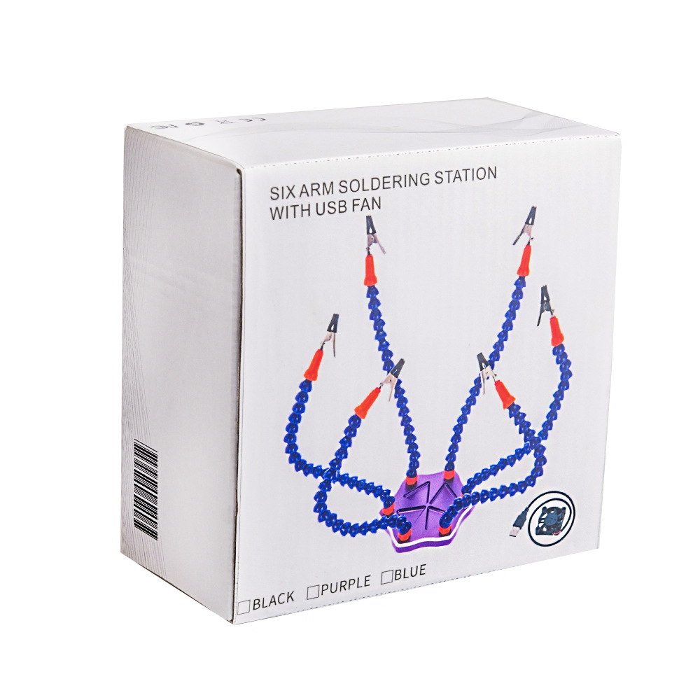 The station features six adjustable jaws that provide a firm and secure hold on various items, from model components to small electronics. The adjustable design allows users to position the jaws for precise holding, accommodating a wide range of shapes and sizes. This six-jaw system is ideal for stabilizing small parts during repair, assembly, or soldering, preventing slippage and ensuring accuracy.