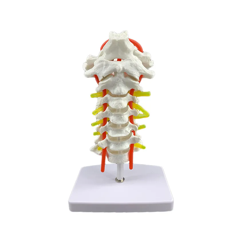 El modelo incluye estructuras etiquetadas y codificadas por colores para facilitar la identificación rápida de las vértebras, los discos intervertebrales y las arterias carótidas. La codificación por colores mejora el aprendizaje al facilitar la distinción entre las diferentes partes anatómicas, como el hueso, el cartílago y las estructuras vasculares. Esta función facilita el aprendizaje visual y ayuda a los estudiantes a comprender la función de cada componente dentro de la columna cervical y el sistema circulatorio. 5. Piezas transversales y extraíbles para un estudio en profundidad. Muchos modelos de columna cervical presentan vistas transversales o componentes extraíbles, lo que permite a los usuarios examinar la estructura interna de las vértebras y el recorrido de las arterias carótidas. Esta función interactiva es valiosa para los cursos avanzados de anatomía, ya que proporciona una visión más detallada de las vías nerviosas, la posición arterial y la alineación vertebral. Permite a los estudiantes desmontar y explorar áreas específicas, profundizando su comprensión de la anatomía cervical y vascular. Diseño compacto y fácil de exhibir