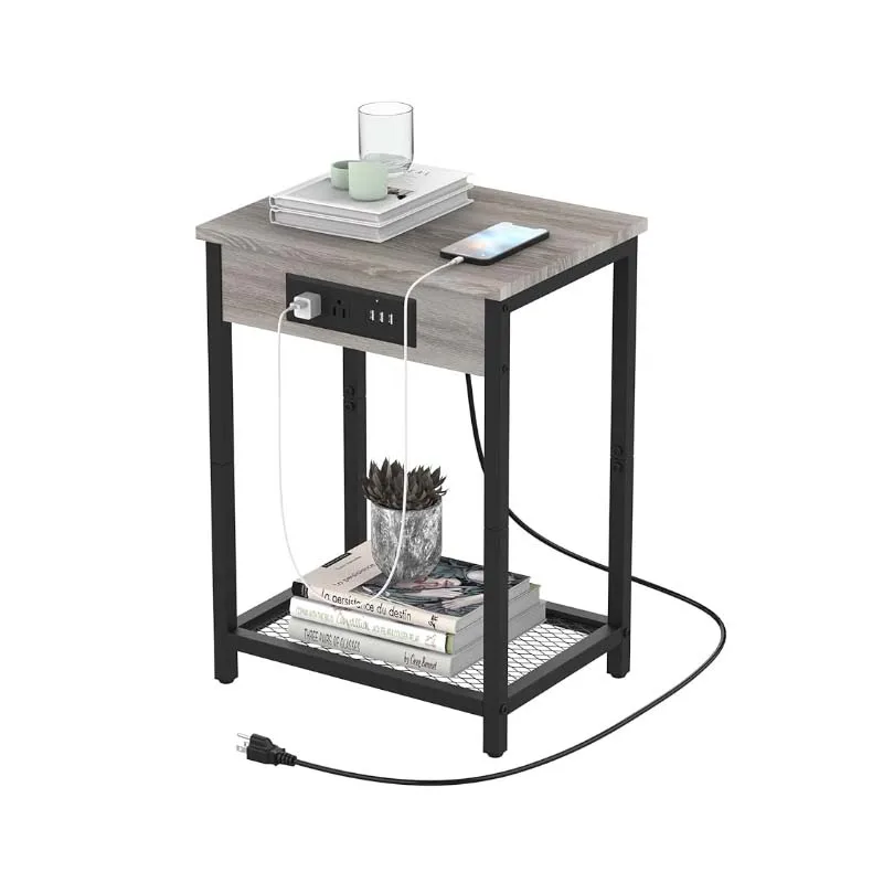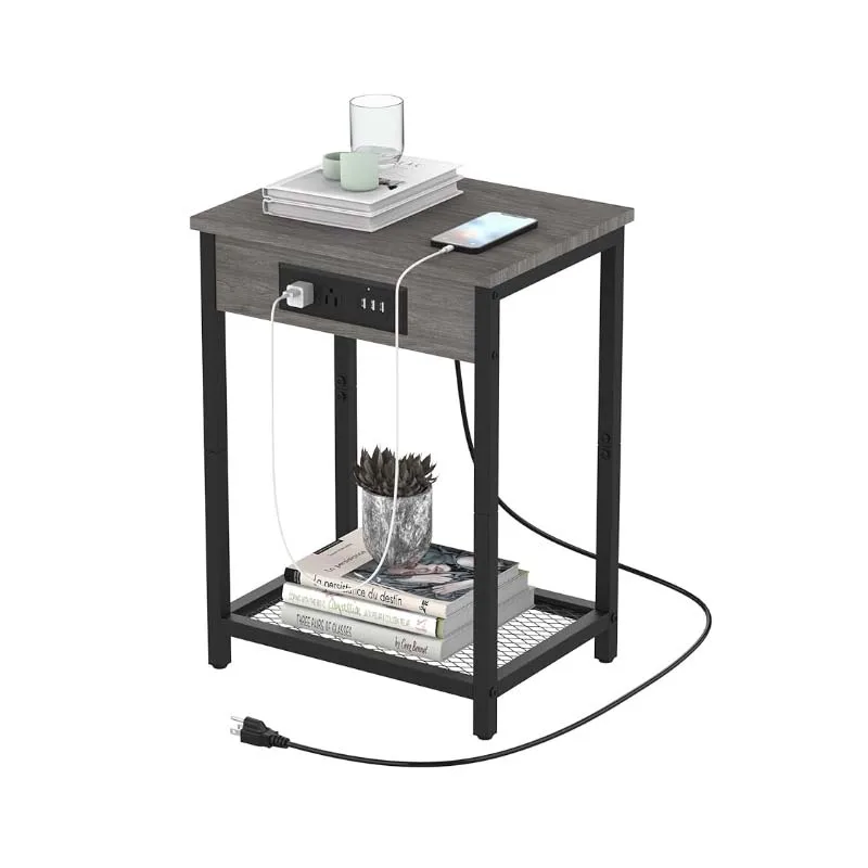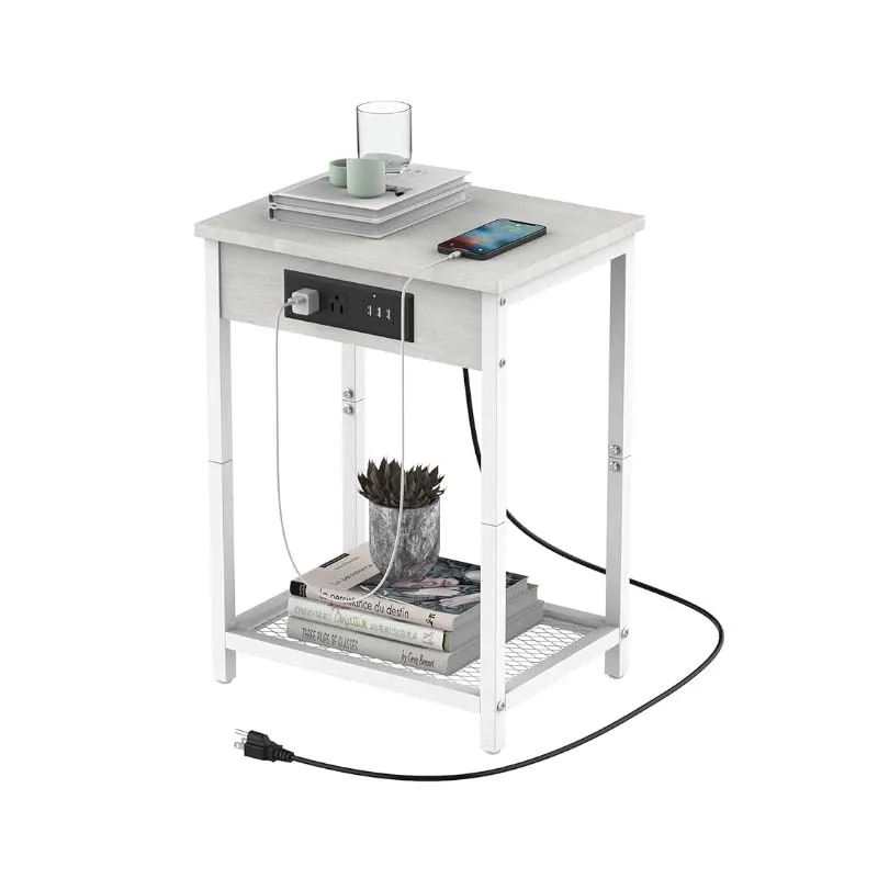 This nightstand is designed to offer practical storage and charging solutions. The built-in charging station includes multiple USB ports and electrical outlets, allowing you to charge your devices easily and keep your bedside area clutter-free. The 2-tier design provides ample storage space for books, accessories, and other essentials, while the top surface can be used to display decorative items or hold a record player. The multifunctional design makes it suitable for use in bedrooms, living rooms, and other spaces where convenient storage and charging are needed.