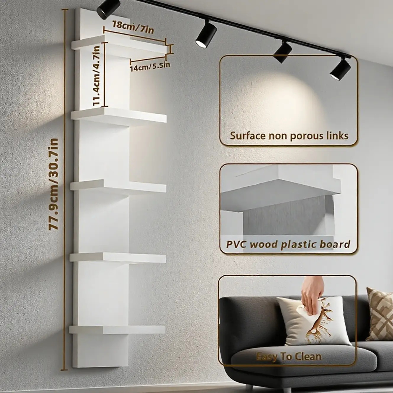 Crafted from PVC wood-plastic board, the surface is non-porous, moisture-resistant, and easy to clean, making it perfect for everyday use. Its sturdy structure ensures reliable support, while the slim profile blends seamlessly into modern interiors. Whether used as a display shelf or functional storage, this wall unit delivers both style and practicality.
