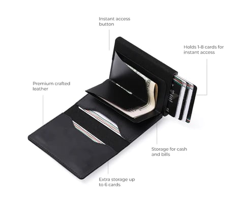 La billetera más segura del mundo. Todas las tarjetas almacenadas en la carcasa protectora de aluminio están protegidas con la tecnología de bloqueo RFID más avanzada disponible.