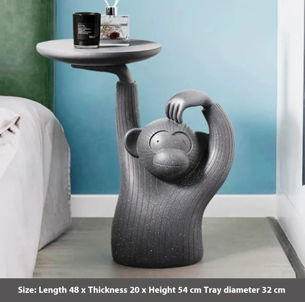 Constructed from durable resin, metal, or reinforced composite materials (depending on the model), the tray offers both visual appeal and structural integrity. The monkey base is sculpted with fine detailing, giving the piece a distinctive character while maintaining balance and stability. The tray surface above is flat and spacious, allowing for secure placement of items without tipping.