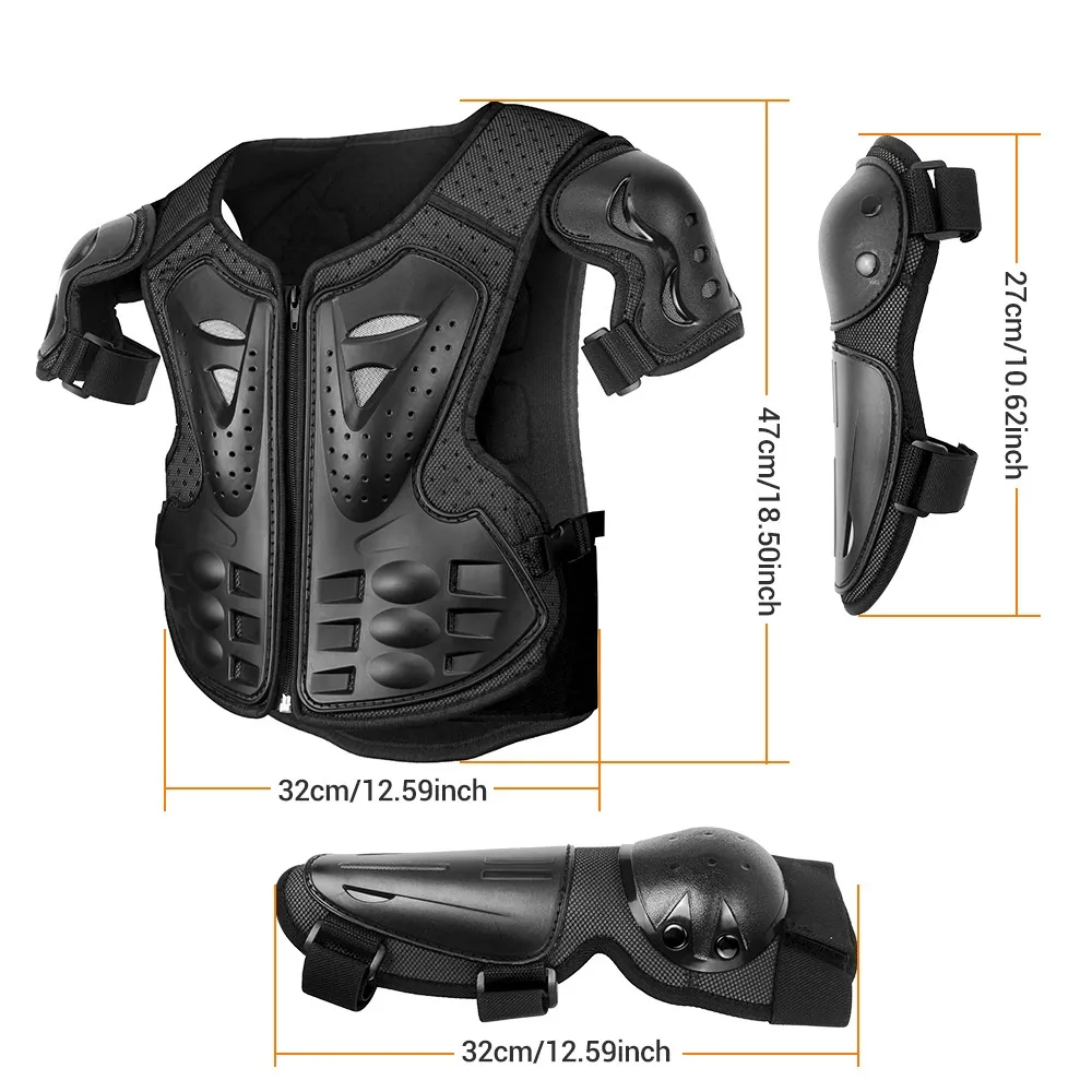 Complete Five-Piece Set: The set includes a helmet, knee pads, elbow pads, wrist guards, and a body armor vest, ensuring