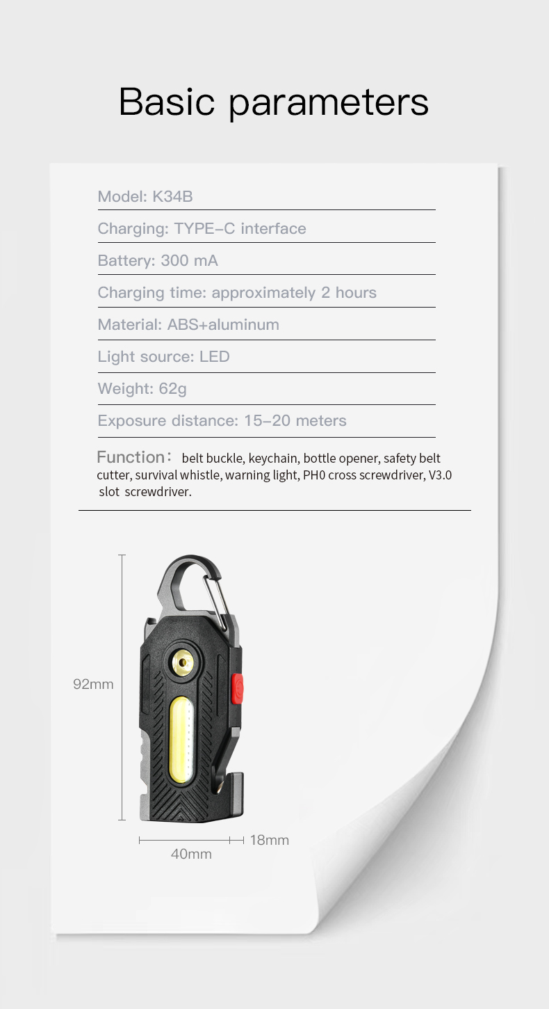 1. Comes with mountaineering buckle, bottle opener, seat belt cutter, survival whistle, warning light, PH0 cross screwdriver, V3.0 slot