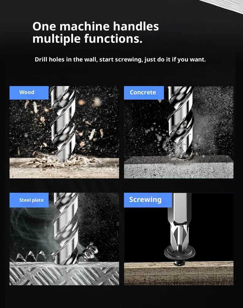 This all-in-one tool works as both an electric drill and a screwdriver, eliminating the need for multiple devices. It comes with a wide selection of drill bits, screwdriver heads, and accessories to handle various applications — from construction and repair to home improvement and crafting.