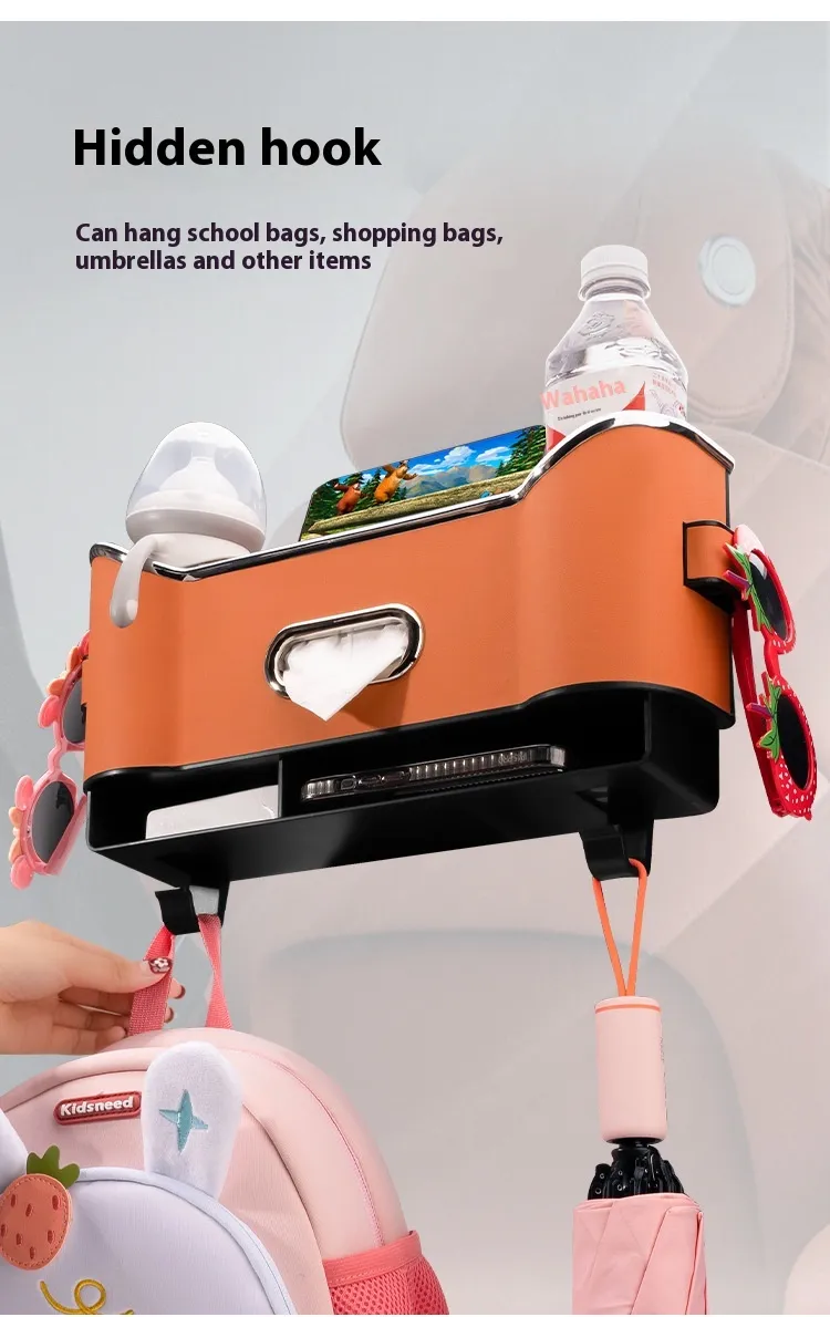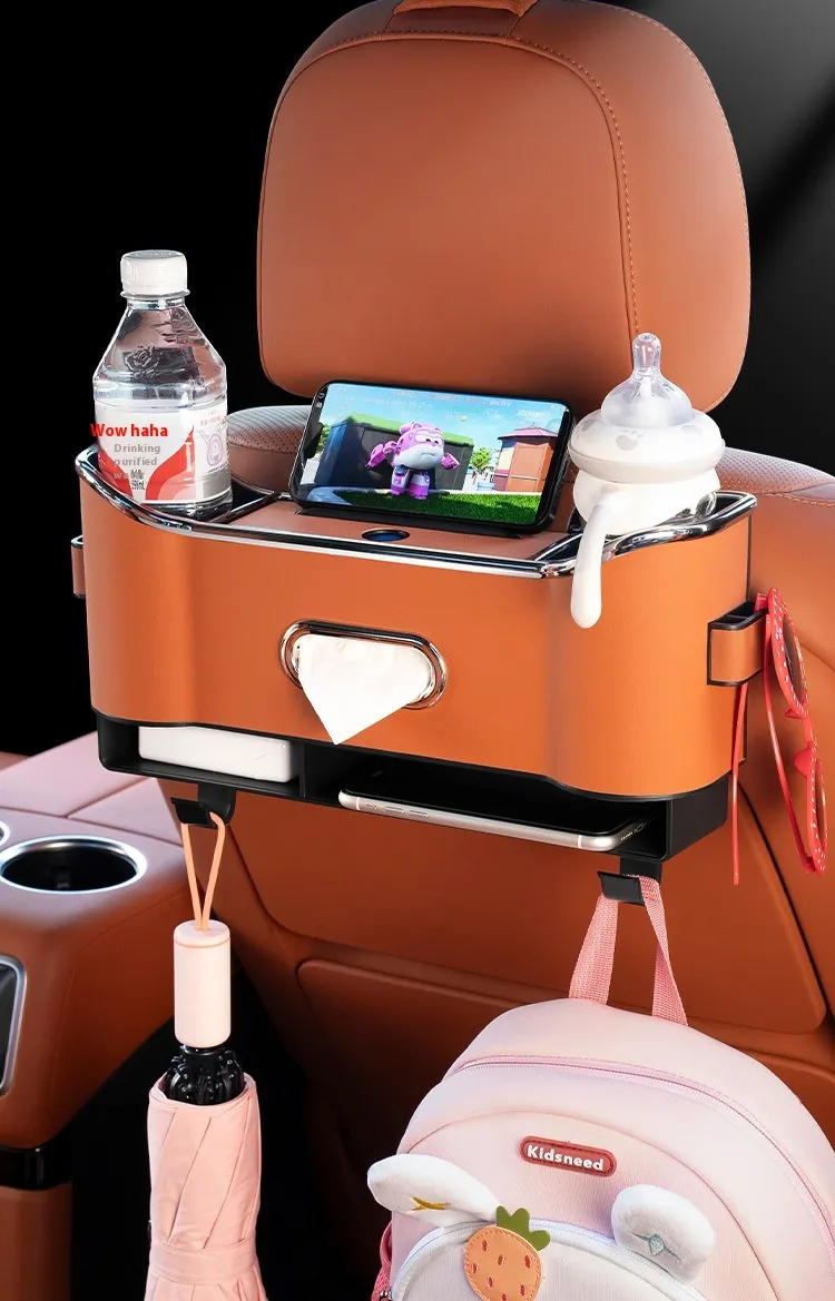 Features water bottle slots, tissue box drawer, bag hooks, and phone holder – maximizing every inch of backseat space.