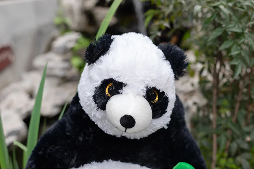 El panda se representa sosteniendo un tallo de bambú, lo que añade un elemento lúdico e interactivo al diseño. El bambú ayuda a completar el aspecto natural del panda y proporciona una característica divertida que los niños pueden explorar y usar en su juego imaginativo. El tallo suele estar hecho de materiales suaves y flexibles que garantizan que sea seguro para los niños manipularlo.