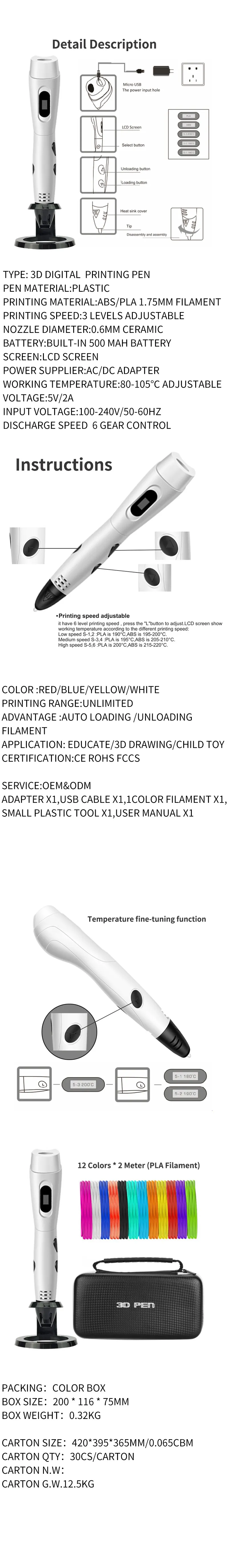 Lightweight and portable, the pen connects easily to a power source and is simple to set up and store. Some models may include features such as an LCD display for temperature control, one-button loading and unloading of filament, and safety functions like automatic sleep when not in use. This makes it a safe and convenient choice for home, classroom, and studio use when used under proper supervision.