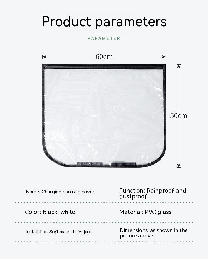 Designed specifically for electric vehicles (EVs) and new energy vehicles, this cover shields your charging ports and cables from rain, snow, dust, and other environmental factors, allowing you to charge your vehicle safely and conveniently regardless of the weather conditions.