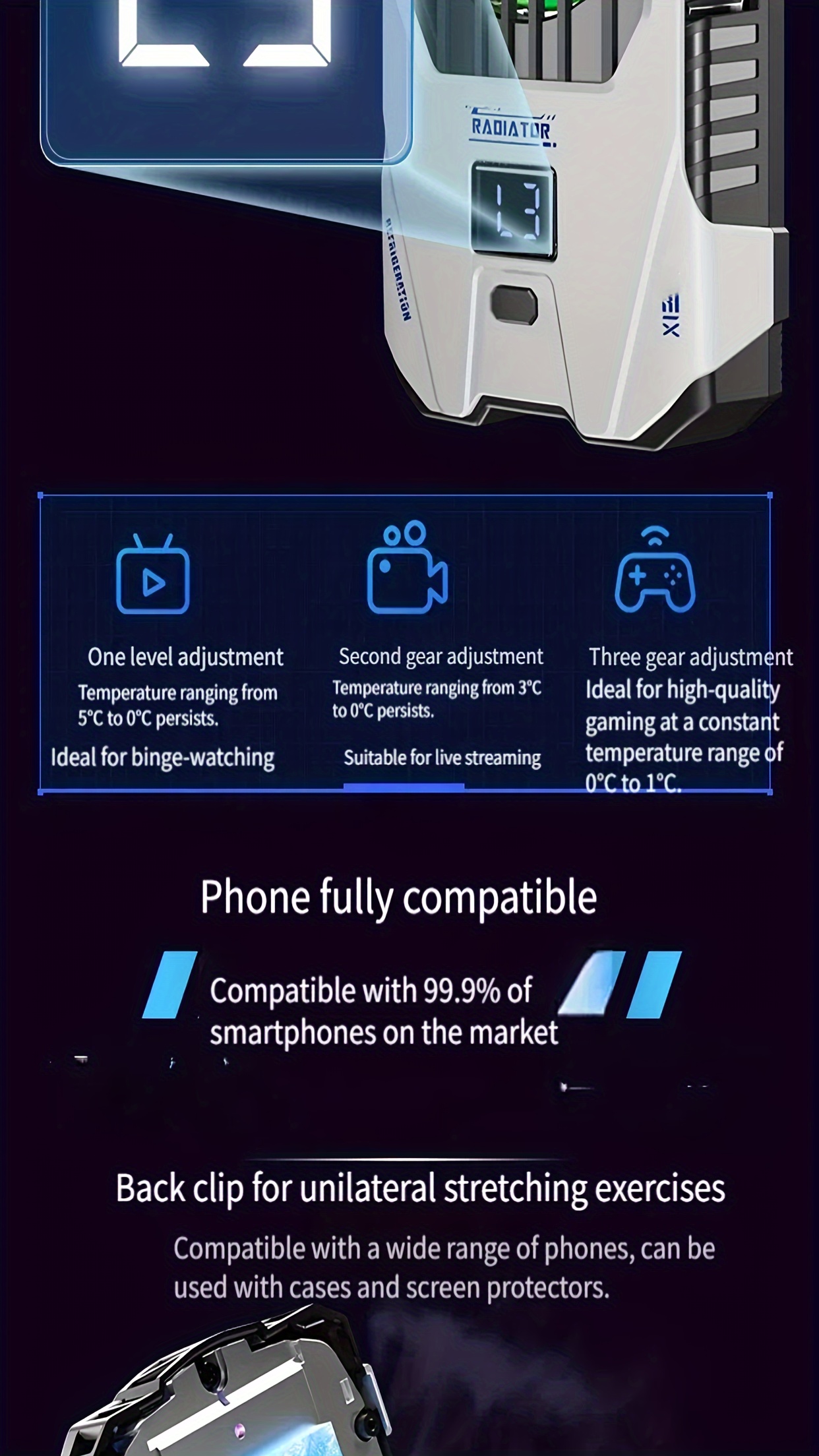 Designed for versatility, the New Semiconductor Mobile Phone Back Clip Heat Sink with 2500mAh Battery for Instant Cooling Suitable for Mobile Game Players and Mobile Live Broadcast Cooling is compatible with 99.9% of smartphones. Its adjustable back clip ensures a secure fit without blocking the screen or interfering with usage.