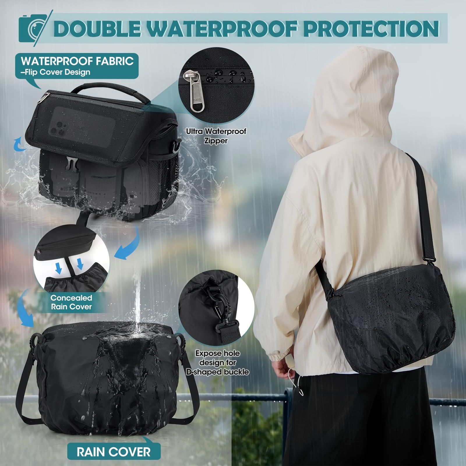 Made with durable, high-quality materials, this camera bag offers excellent waterproof protection, ensuring your equipment stays dry even in rainy conditions. The bag features a rain cover that provides additional protection against the elements. The convenient tripod holder allows you to attach a tripod securely to the bag, making it perfect for photographers who need to carry their tripod along with their camera gear.