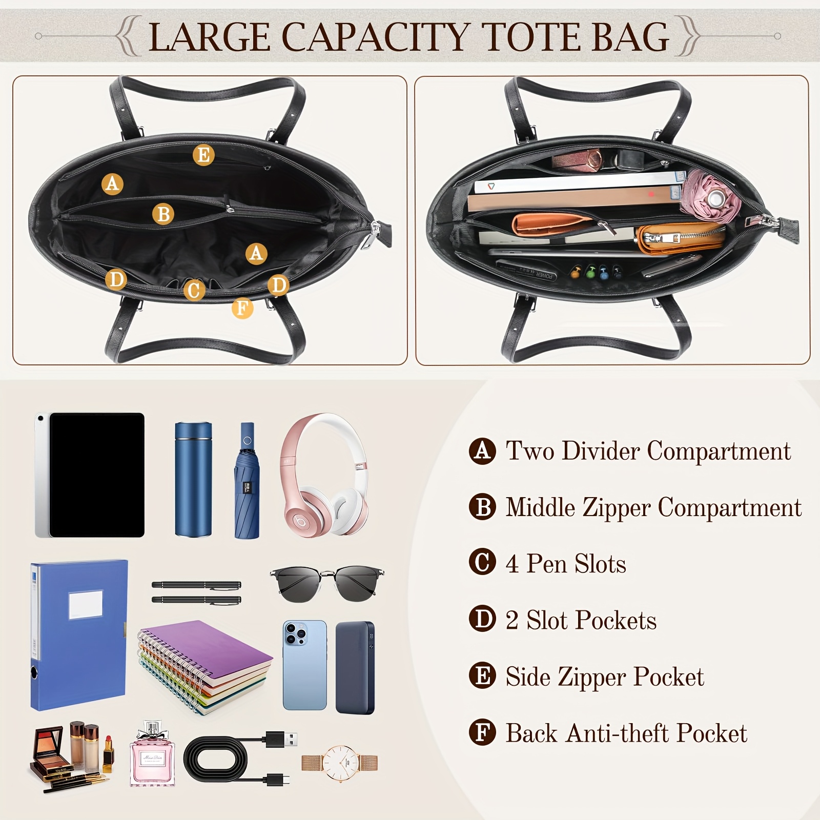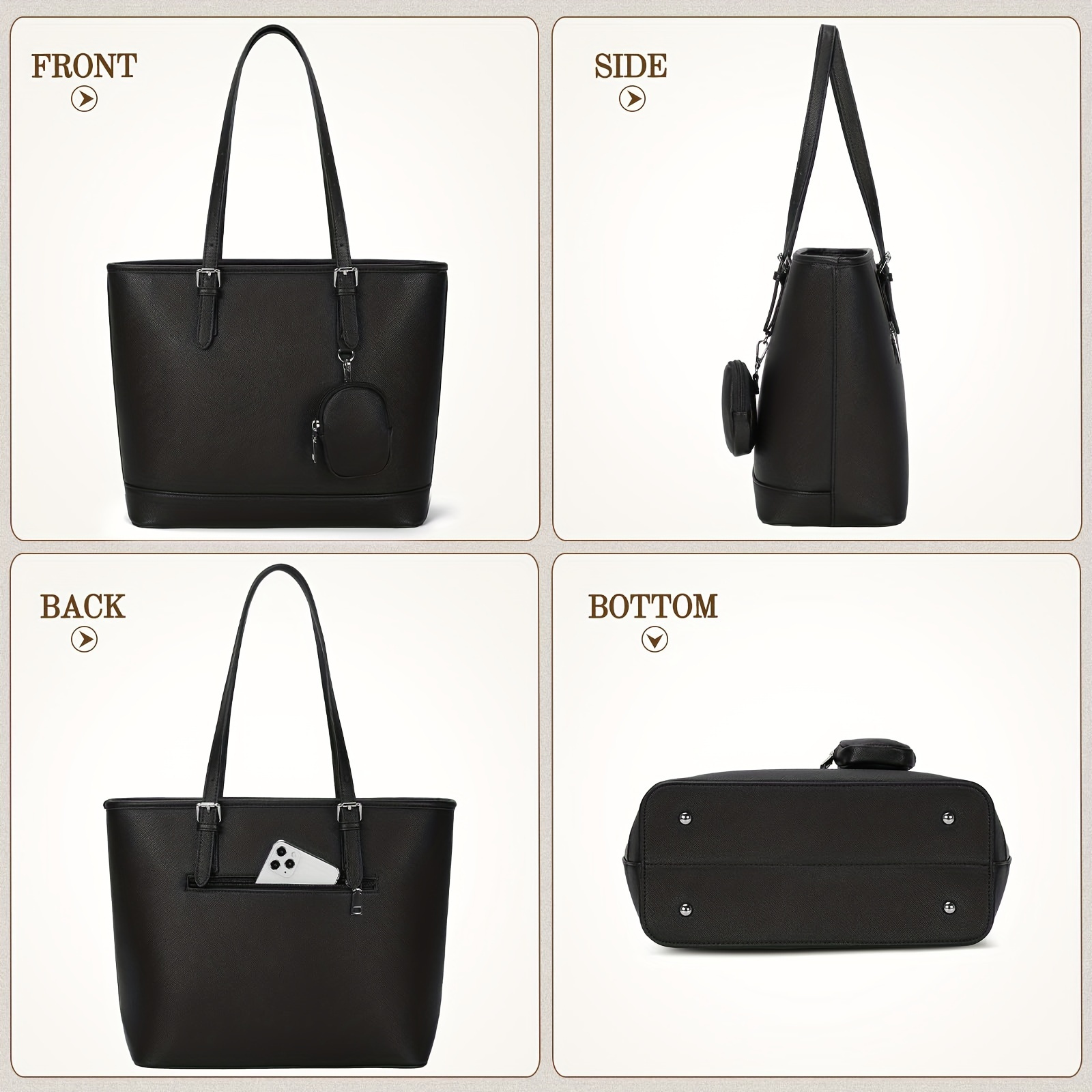 - Large Capacity: Ample space for laptops, notebooks, cosmetics, and more.