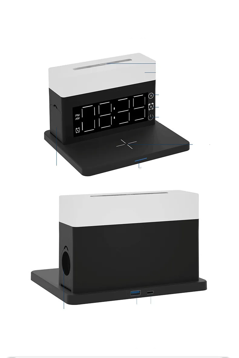 Streamline your nighttime essentials with this multifunctional device. Whether you're looking for a way to keep track of time, enjoy soft lighting as you wind down, or charge your phone wirelessly, this versatile gadget offers it all. Its sleek and minimalist design complements any bedroom decor, providing a smart and efficient way to keep your essentials in one place.