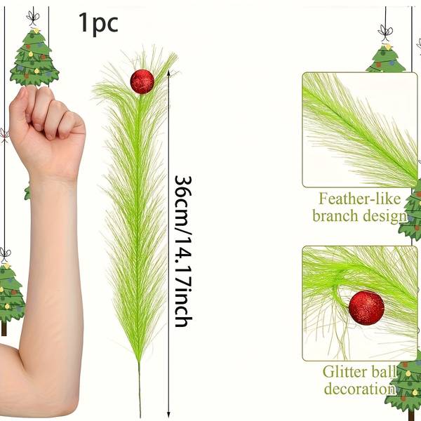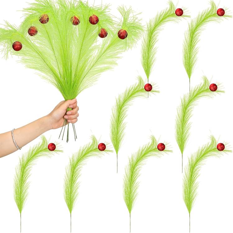 NLDD 12pcs Artificial Christmas Tree Stems – Lime Green Furry Holiday Picks with Red Berries