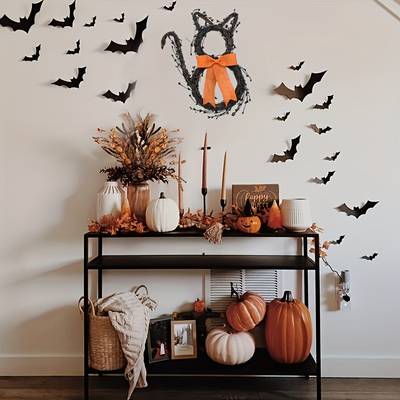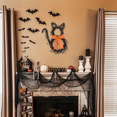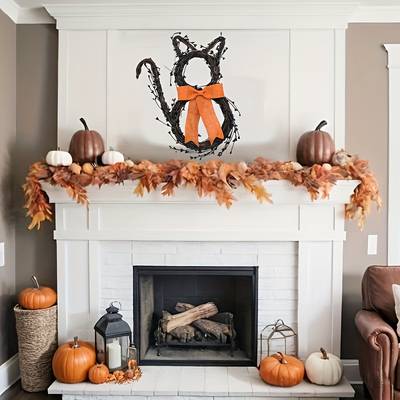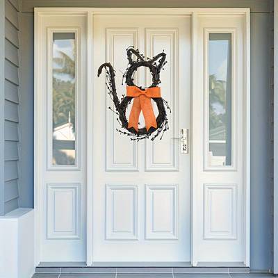 This decorative wreath features a detailed black cat silhouette in the center of a twig-inspired ring, giving it a classic Halloween look. Designed for door mount display, it hangs easily on hooks, nails, or wreath hangers without tools.