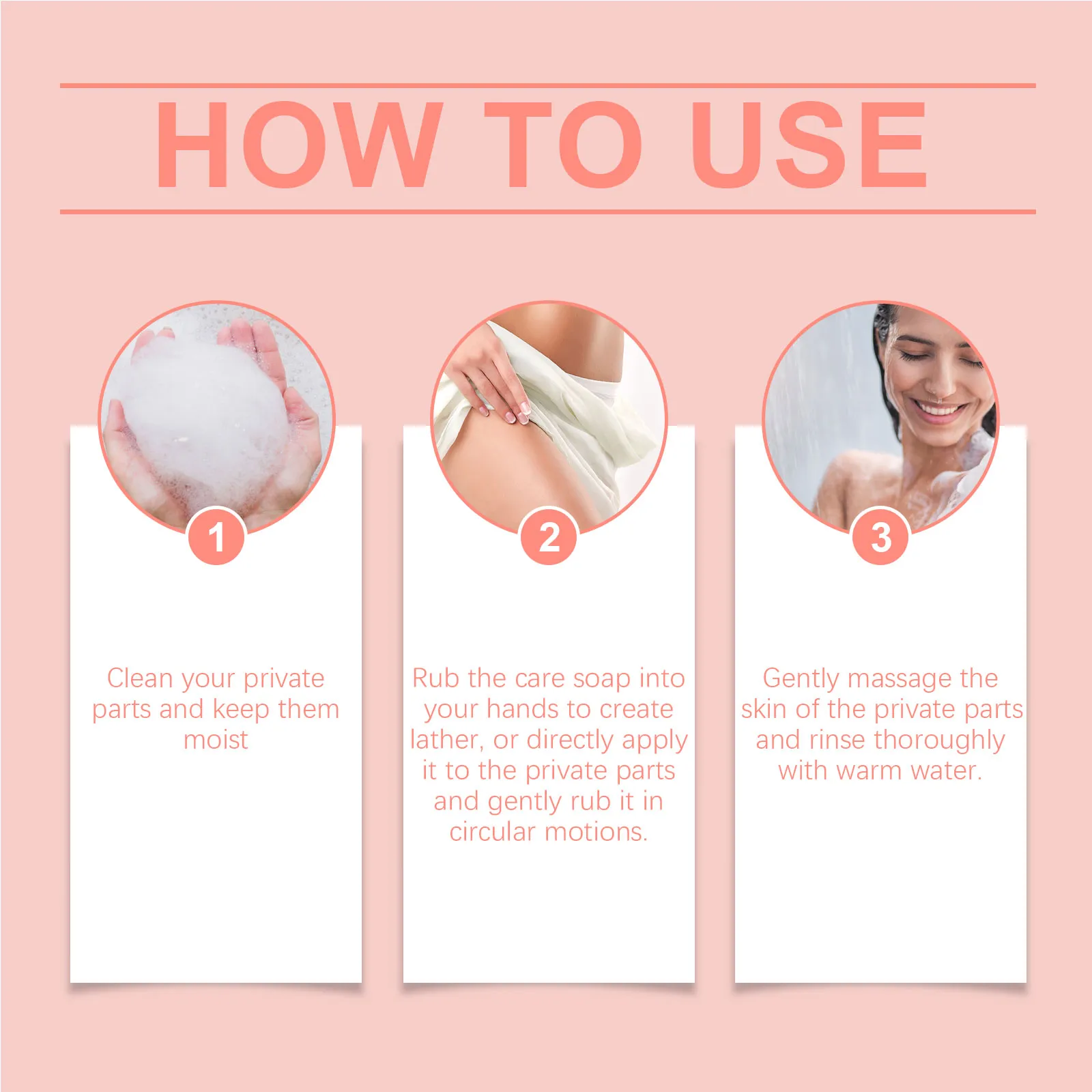 Our women's body soap contains peach extract, glycerin, aloe vera extract. It cleans private areas, helps keep them fresh and clean, and reduces odors. The way to use it is simple: 1. Clean your private parts and keep them moist; 2. Rub the soap on your hands or apply it directly to your private parts in a gentle circular motion. 3. Gently massage the skin of your private area and rinse thoroughly with warm water. Easy to produce a fine foam, deep clean easy to rinse without residue, and keep skin soft.