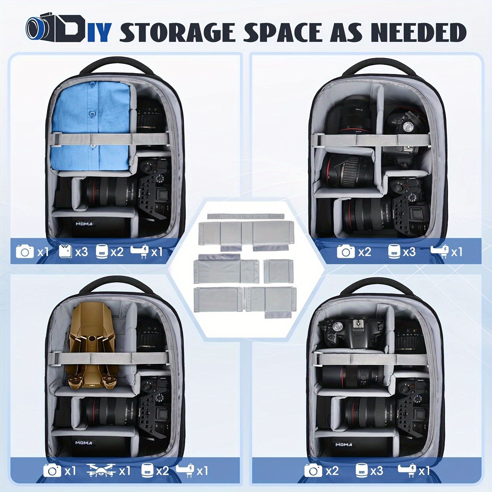 Fits cameras, lenses, chargers, SD cards, and essential gear with shock-absorbing dividers.
