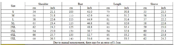 Tallas: S, M, L, XL, 2XL, 3XL, 4XL, 5XL