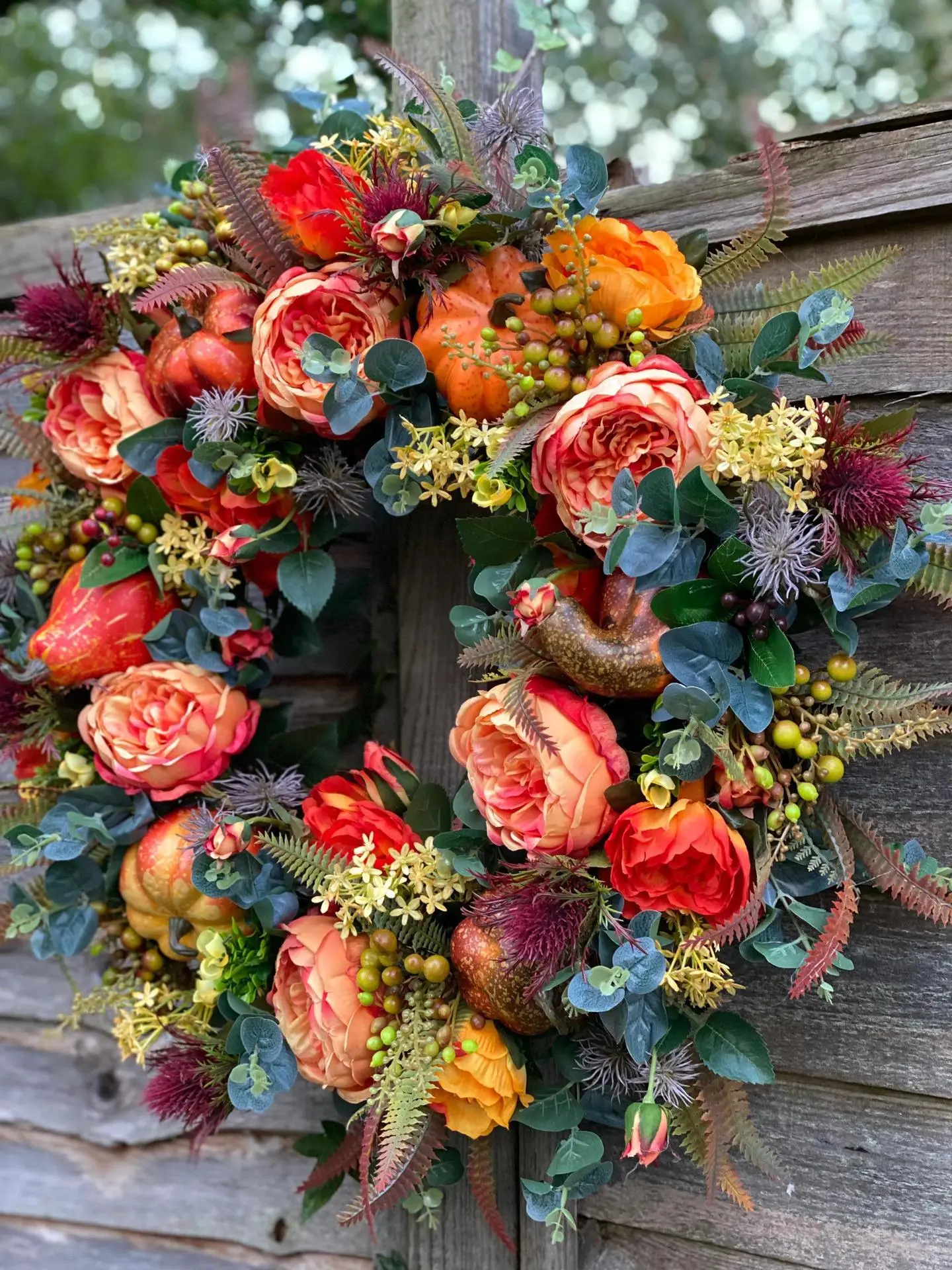 Nueva corona de calabaza de Halloween con peonías otoñales para decoración del hogar