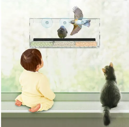 El comedero acrílico para pájaros es versátil y perfecto para quienes desean observar aves de cerca mientras se alimentan. Colóquelo en una ventana para disfrutar de la experiencia de observar aves en interiores o en un balcón o patio para atraer más aves a su espacio exterior. Su diseño transparente y su práctica instalación lo convierten en el favorito tanto de principiantes como de aficionados a las aves.