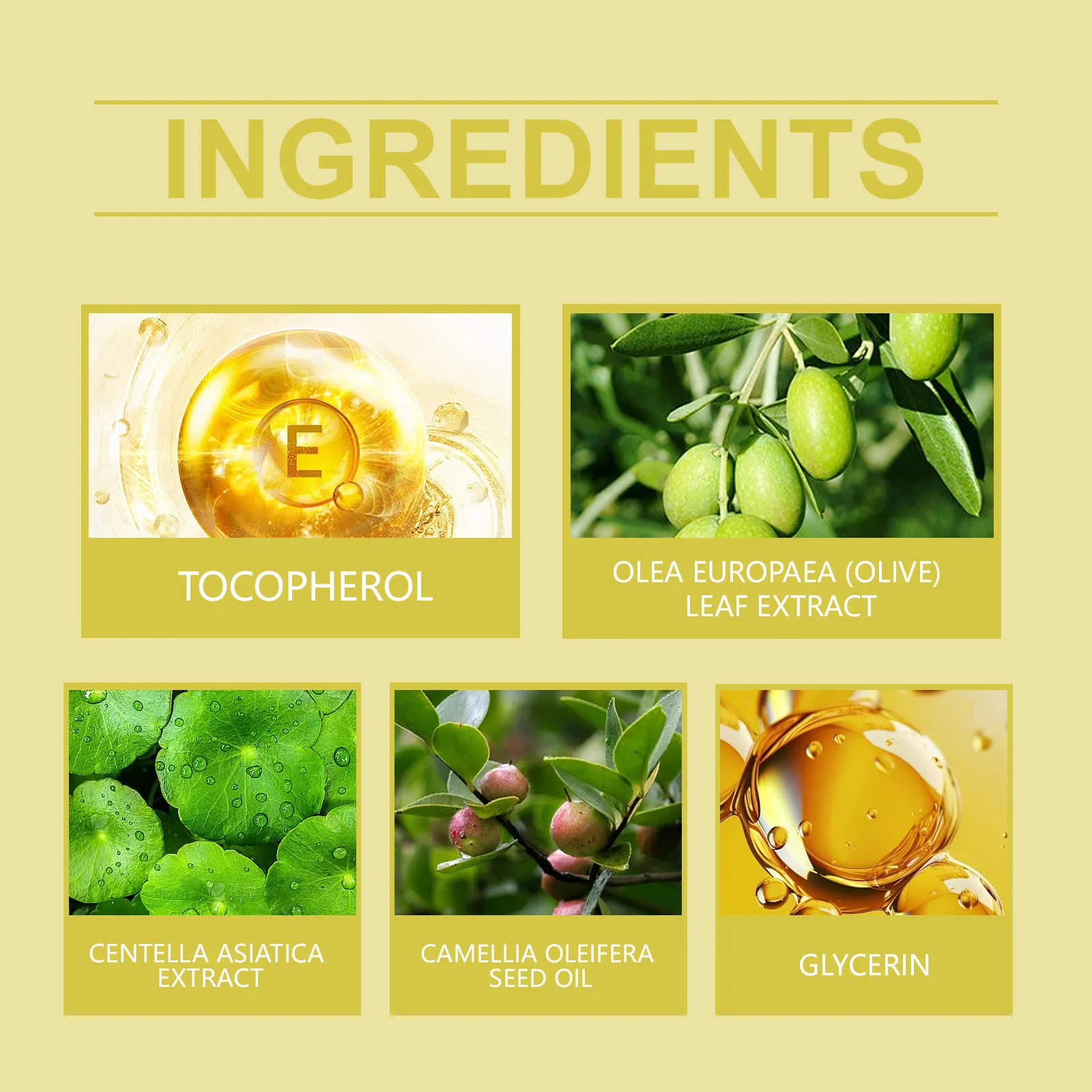 Ingredients: glycerin, camellia-seed oil, olive leaf extract, asiatic centella extract, vitamin E (tocopherol)