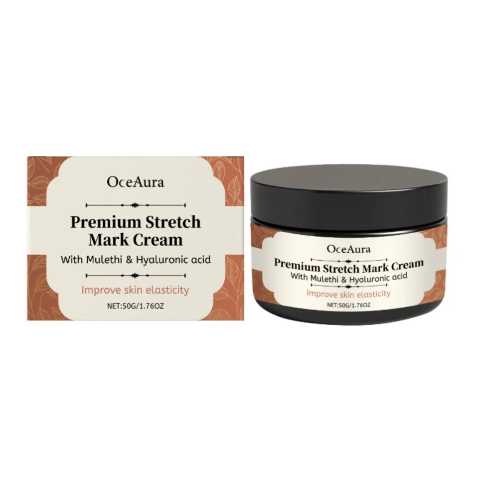 Buy OceAura Premium Stretch Mark Cream to reduce the appearance of stretch marks, improve skin elasticity, and hydrate your skin with Mullethi and Hyaluronic Acid.