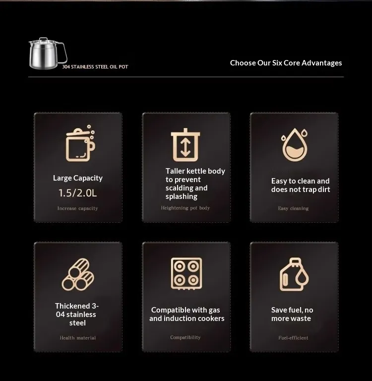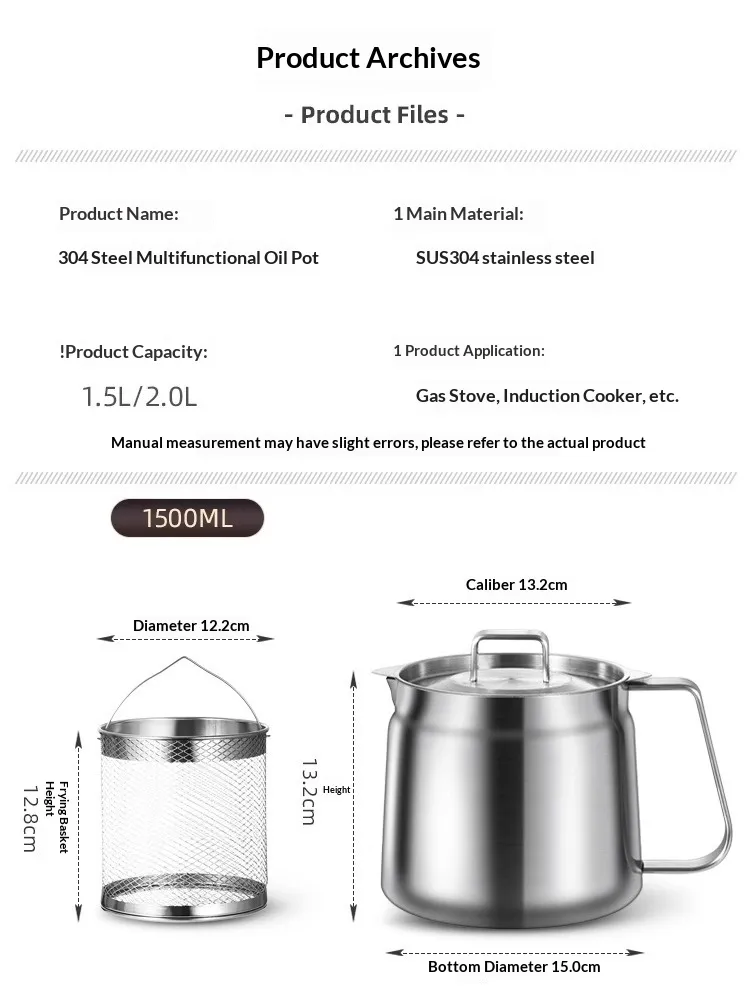 [With filter, fry basket, and tongs] 304 stainless steel oil filter—1.5 liters; [With filter] 304 stainless steel oil filter—2.0 liters;
