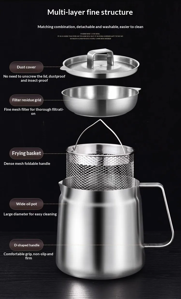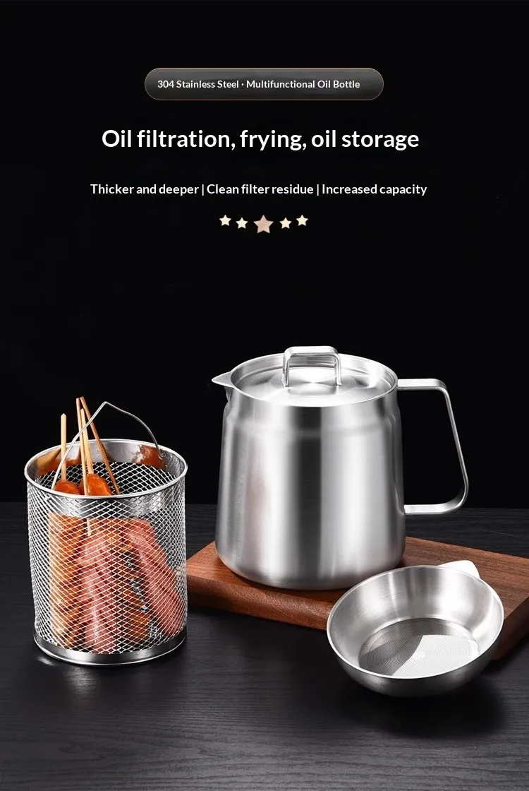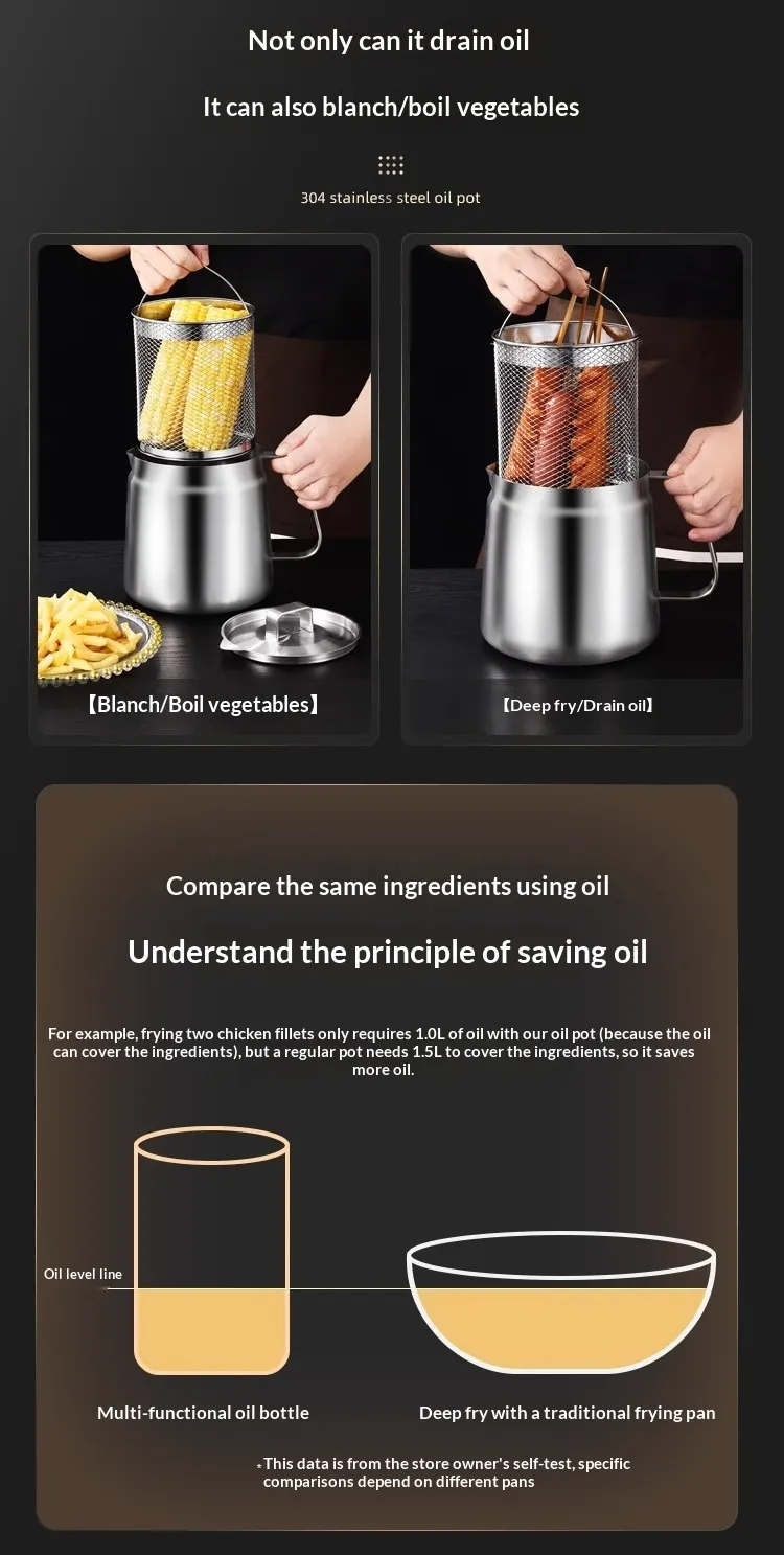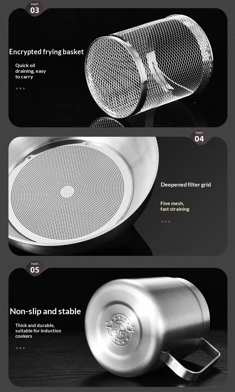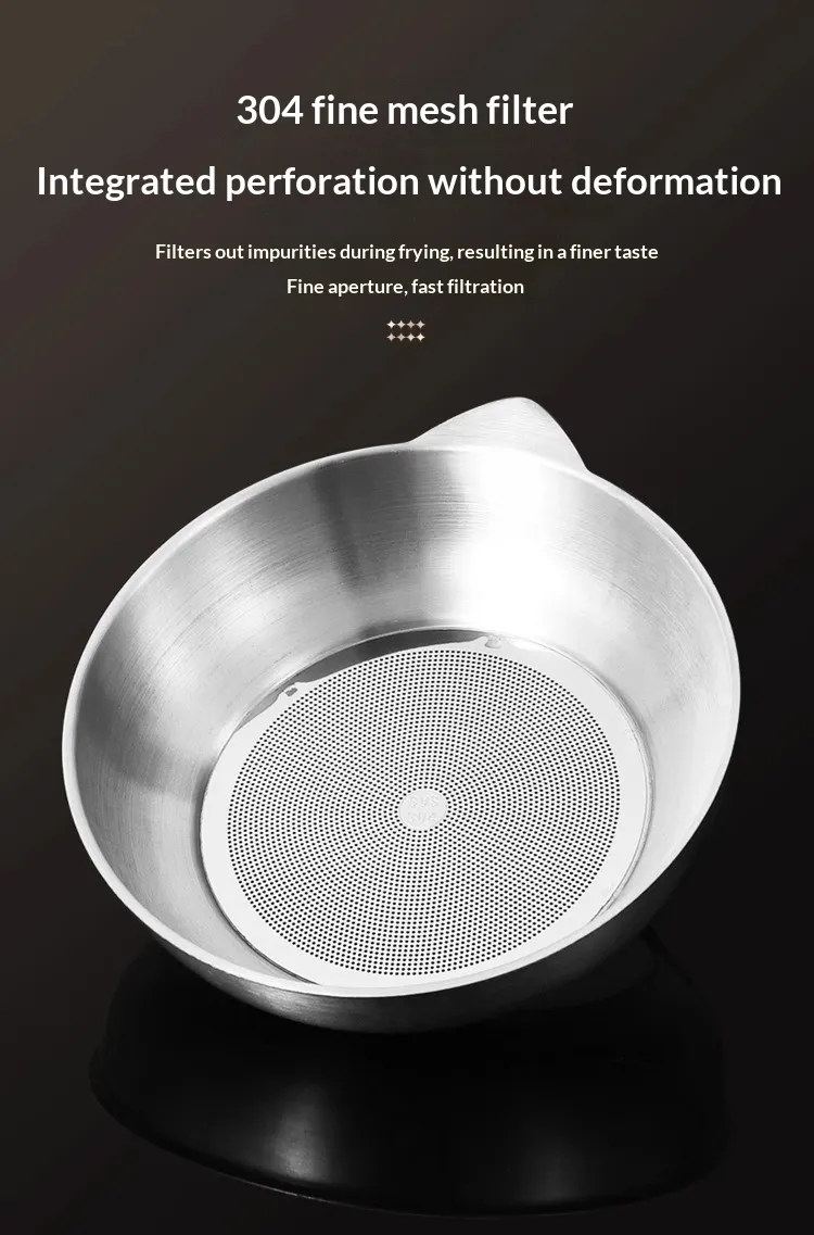 Capacity: [With filter] 304 stainless steel oil filter—1.5 liters; [With filter and fry basket] 304 stainless steel oil filter—1.5 liters;