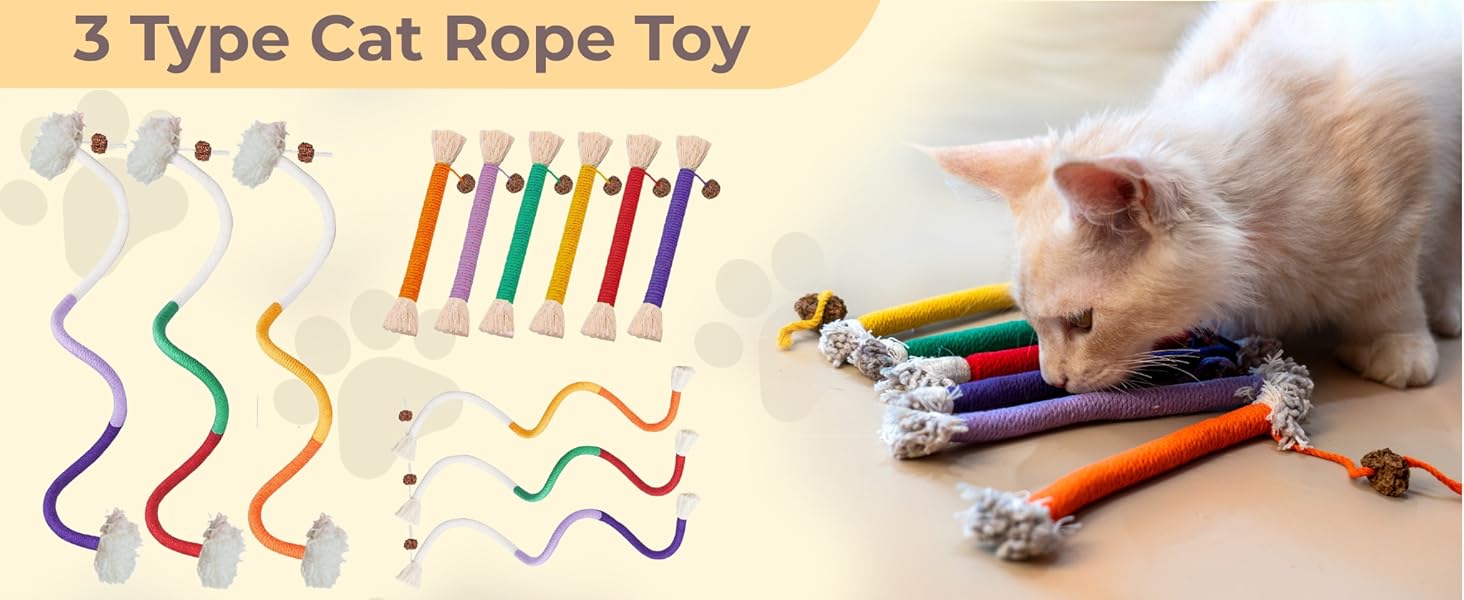 - Quiet Play: These soft colorful ropes provide enriching quiet playtime without bothering cat owner's sleep or life. Your kitty will love the funny snake-like shapes, enhancing their playtime with every pounce and bite.