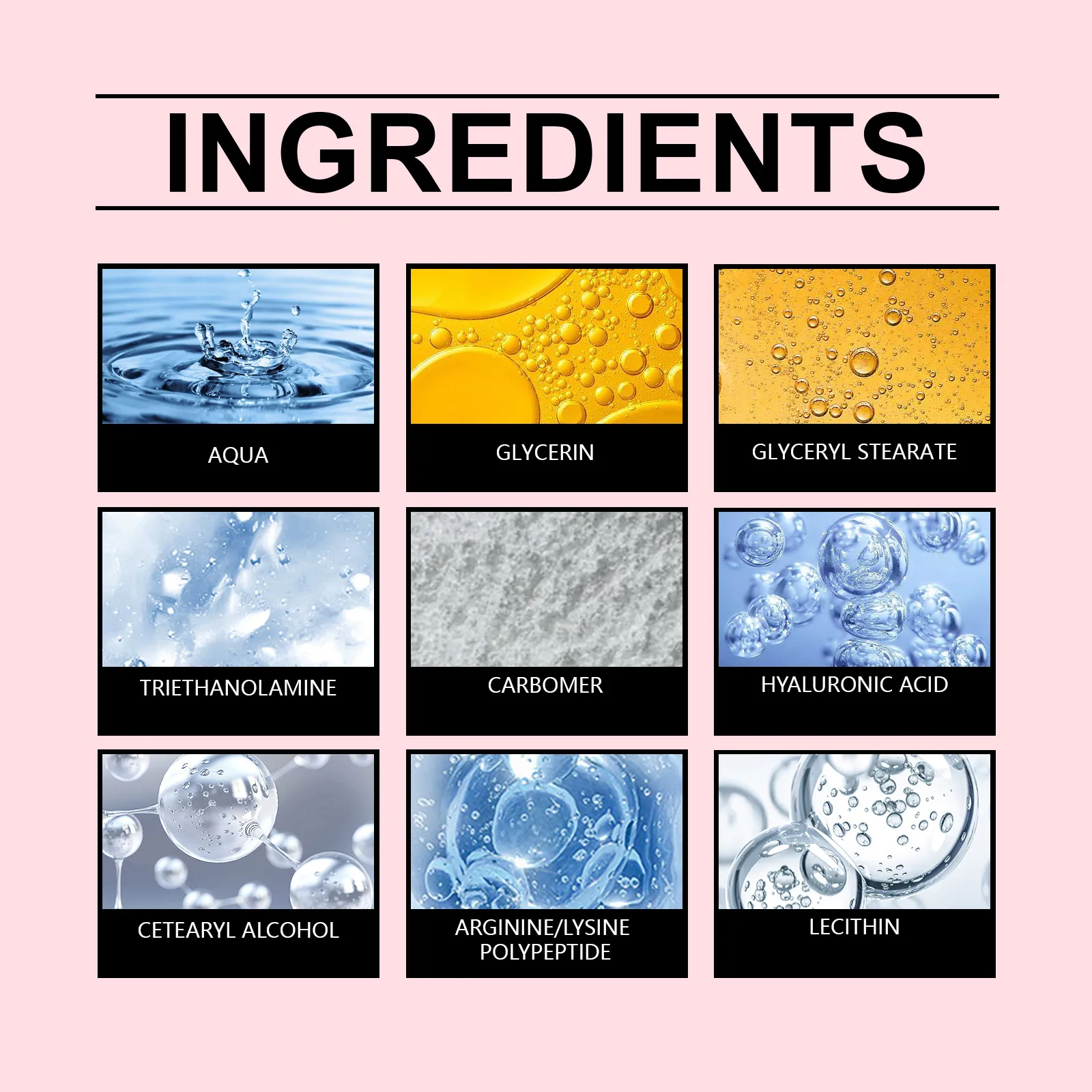 Ingredients: Water, glycerin, cetyl stearate, Glyceryl stearate, carbomer, triethanolamine, hyaluronic acid, arginine/lysine polypeptide,