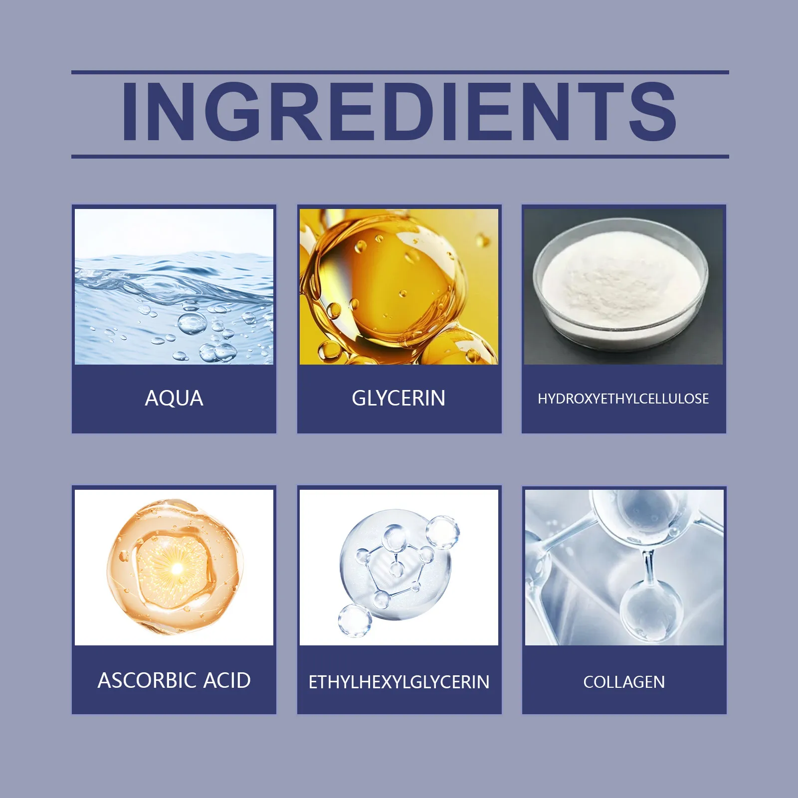 Ingredients: Water, glycerol, Hydroxyethyl Cellulose, collagen, ethylhexyl glycerol, ascorbic acid (vitamin C)