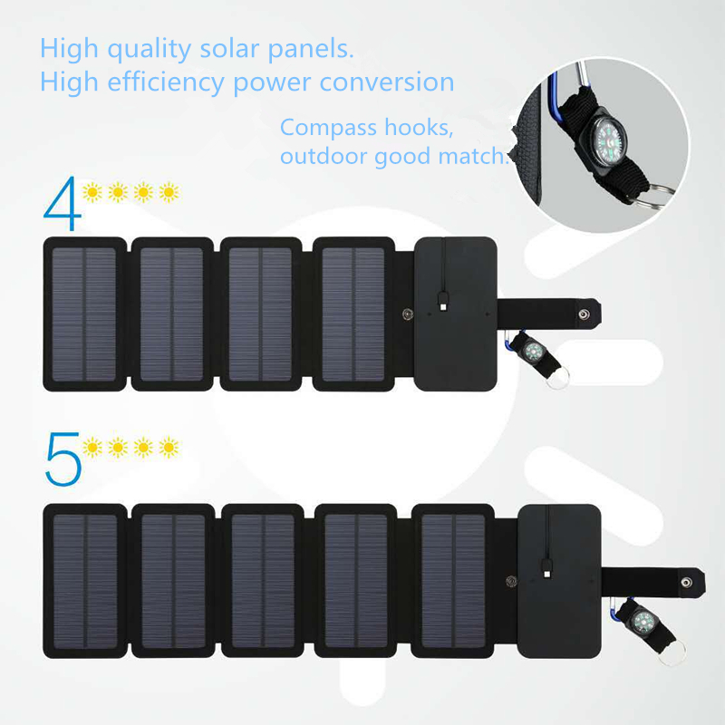 One of the most convenient aspects of this solar panel charger is its foldable design. When not in use, it folds down into a compact, lightweight package, making it easy to store in your backpack or luggage. This space-saving feature is particularly useful for hikers, campers, and travelers who need to minimize the size and weight of their gear.When unfolded, the solar panel reveals a larger surface area, maximizing its ability to capture sunlight and efficiently charge your devices. This portability ensures that you can take it with you wherever you go without adding extra bulk or weight to your gear.