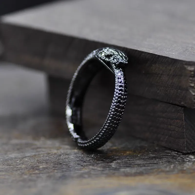 The oxidized detailing enhances the intricate design by emphasising the engraved serpent pattern. This contrast between darkened grooves and lighter silver surfaces gives the ring a distinctive artistic quality.