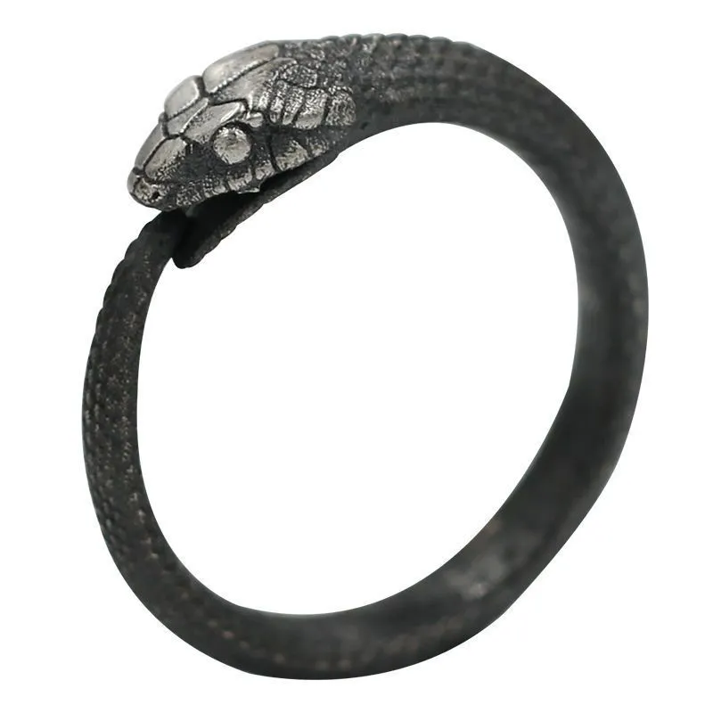 The oxidized detailing enhances the serpent design by creating contrast between darker recessed areas and lighter silver surfaces. This contrast adds texture and depth to the ring’s appearance.