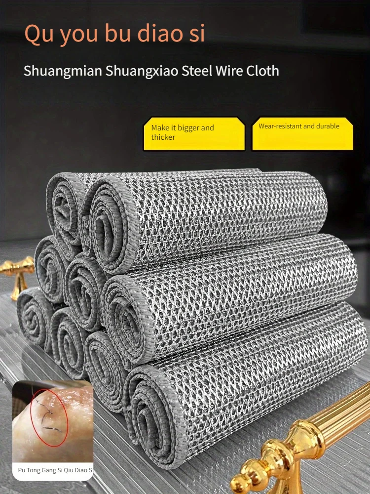 Fabricado con materiales de alta calidad, el paño de cocina de alambre antirrayas combina la resistencia de la malla metálica con la delicadeza necesaria para superficies delicadas. Su diseño de doble cara presenta un lado rugoso para eliminar la suciedad incrustada y un lado más liso para una limpieza suave. Sus propiedades a prueba de aceite y de fácil enjuague garantizan que el paño permanezca limpio y sin olor después de cada uso. />