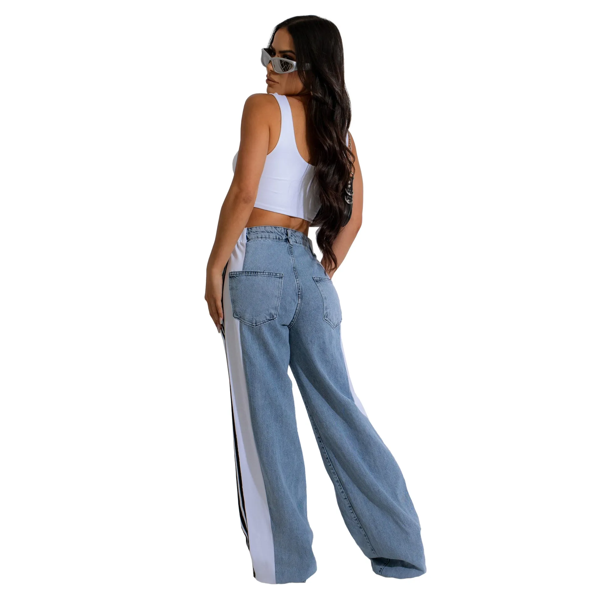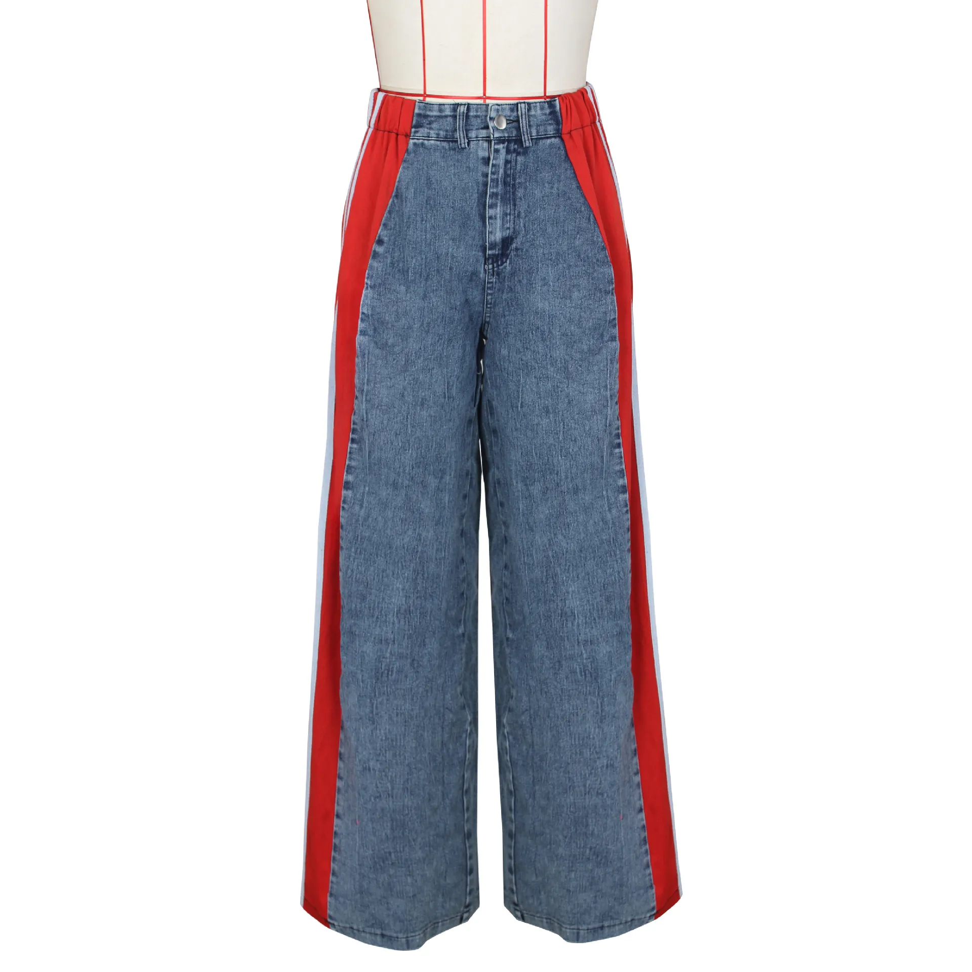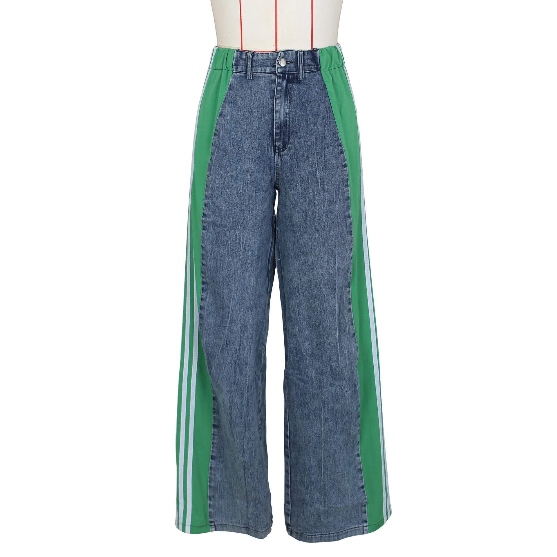 Pantalones casuales de moda 2024 de cintura alta, elásticos, de pierna recta, con tres rayas y parches de mezclilla, pantalones de pierna ancha, ropa de calle