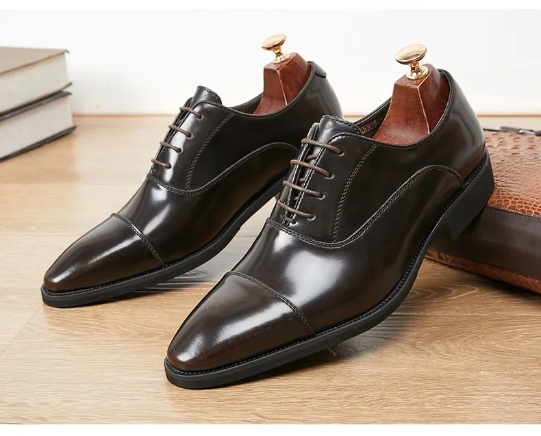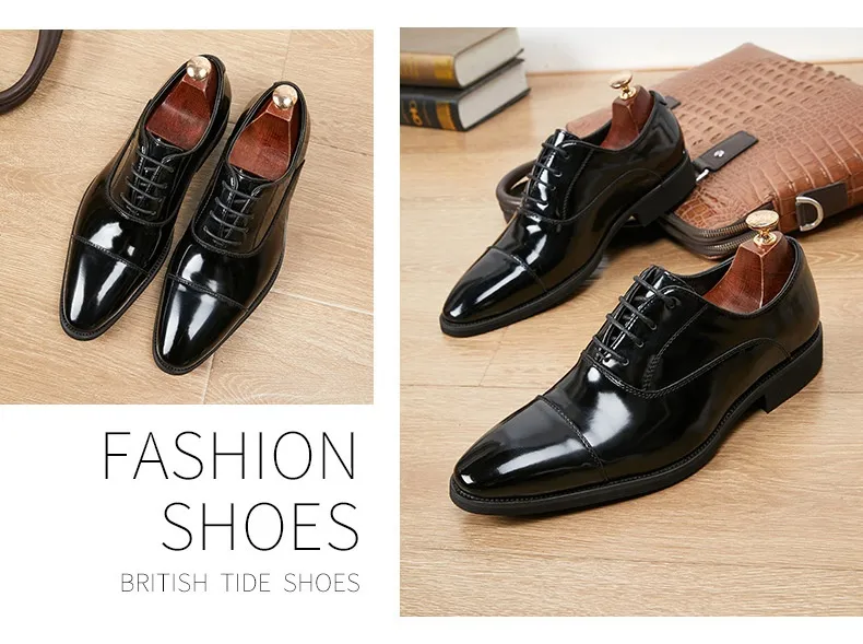 Crafted with high-quality patent leather, these Oxford shoes boast a smooth, shiny finish that enhances their stylish appeal. The reflective surface gives the shoes a sophisticated, high-end look that is perfect for formal occasions and professional environments. The sleek design, complemented by the pointed toe, adds a modern edge to this classic footwear style, making them a must-have for any man who appreciates refined fashion.