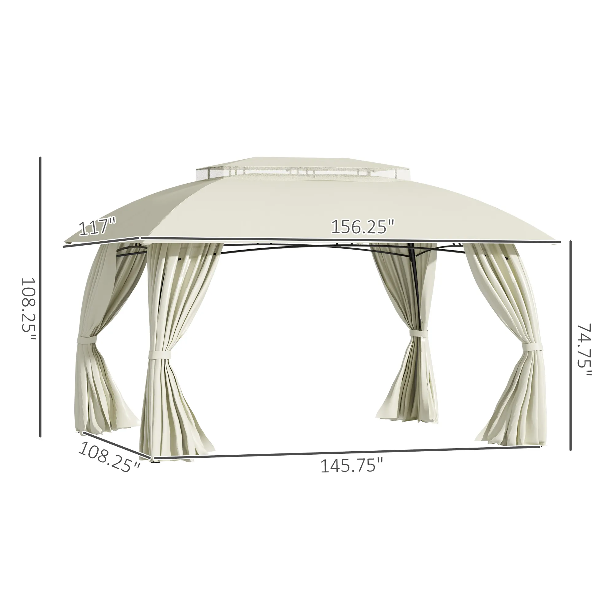 Our canopy gazebo features a rounded 2-tier roof to stop sunburns and keep you cool. Made of fade-protected PA-coated polyester and strong steel, our gazebo canopy holds up to weathering and is ready for repeat use. Keep guests comfortable in the shade with an extra-large floor plan. With curtains closed, it can keep out wind, glare, and winged annoyances. The vent provides a pleasant breeze when you use the sidewalls. So, plan a picnic and prepare a barbeque, get out, get comfy, get Outsunny. Features: - Spacious yet elegant design - 2-tier vented rooftop to enjoy the breeze and better endure the wind - PA-coated polyester protects it and you from UV - Easy hook and loop sidewall curtains keep out wind, glare, and winged annoyances - Steel frame for stronger support - Eight support stakes for mounting it to soft ground - Assembly required Specification: - Color: Beige - Materials: Steel, Polyester - Overall Dimensions: 13' L x 9.7' W x 9' H - Eaves Height: 6.2' H - Column Spacing: 12.1' L x 9' W - Item Label: 84C-326CW - Please do not use it during floods, extreme wind, or snow Package Includes: - 1 x Gazebo - 8 x Ground Stake - 1 x Manual.
