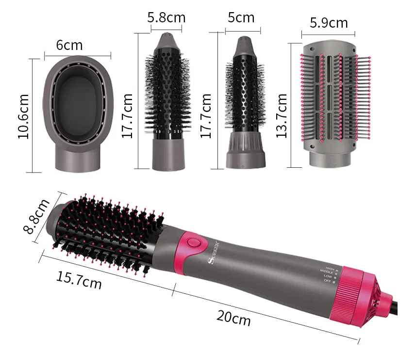 - Múltiples accesorios: Incluye varios cabezales de cepillo, como un cepillo redondo, un cepillo plano y un peine curvo, para adaptarse a diferentes texturas y estilos de cabello, dándote la flexibilidad de crear rizos elegantes y con volumen o un cabello liso y pulido.