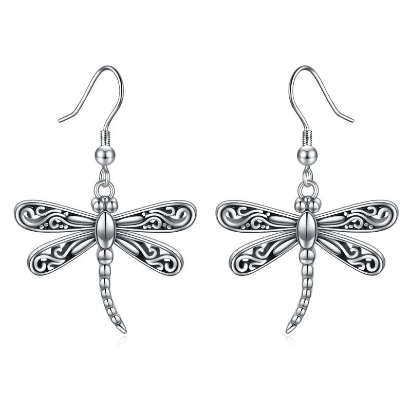 Pendientes colgantes de libélula en plata de ley oxidada