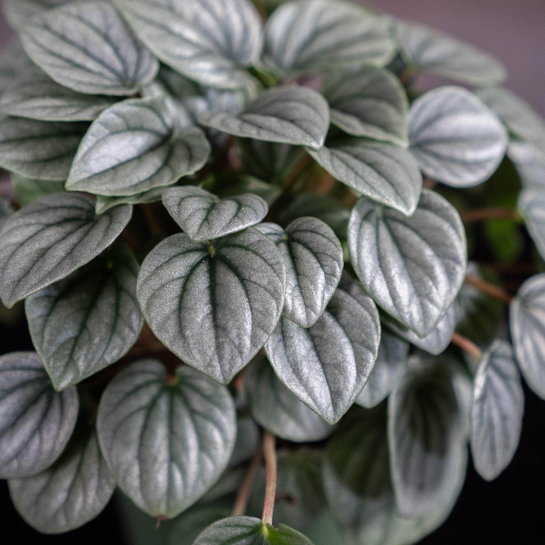 Peperomia caperata 'Frost' features heart-shaped leaves that are thick, textured, and deeply corrugated, giving them a unique and tactile appeal. The leaves are a stunning silvery-green color, resembling a delicate frost that sparkles under the light. The undersides of the leaves are a contrasting deep green, adding to the plant's visual interest. The foliage grows in a rosette pattern, creating a dense and lush display that is both compact and eye-catching.