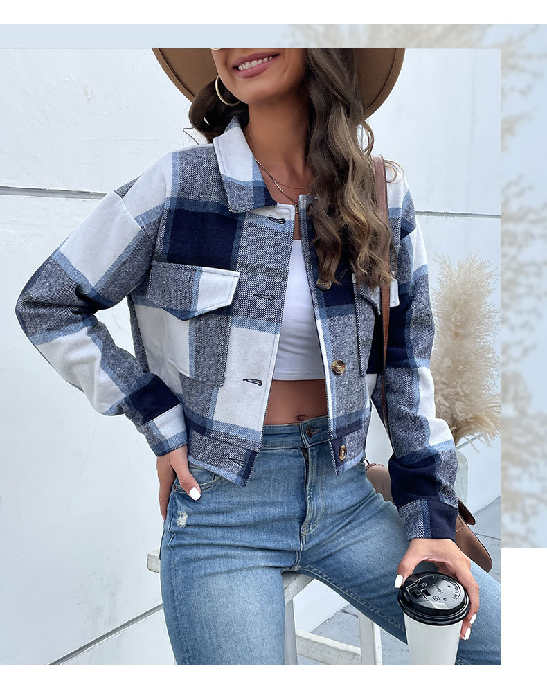 Plaid Lapel Cropped Jacket With Pockets Fashion Button Long Sleeve Short Outwear Tops Coat For Womens Clothing