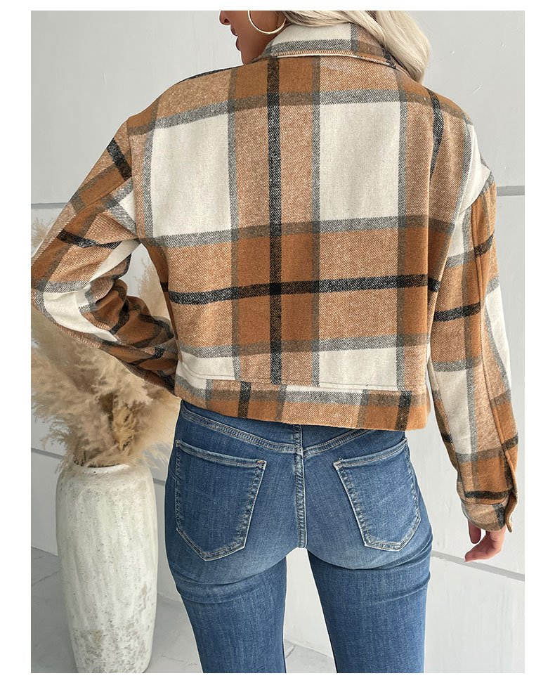 Embrace the fall season in style with this Plaid Lapel Cropped Jacket with Pockets. This chic, versatile outerwear piece combines fashion and function, making it an essential addition to your wardrobe.