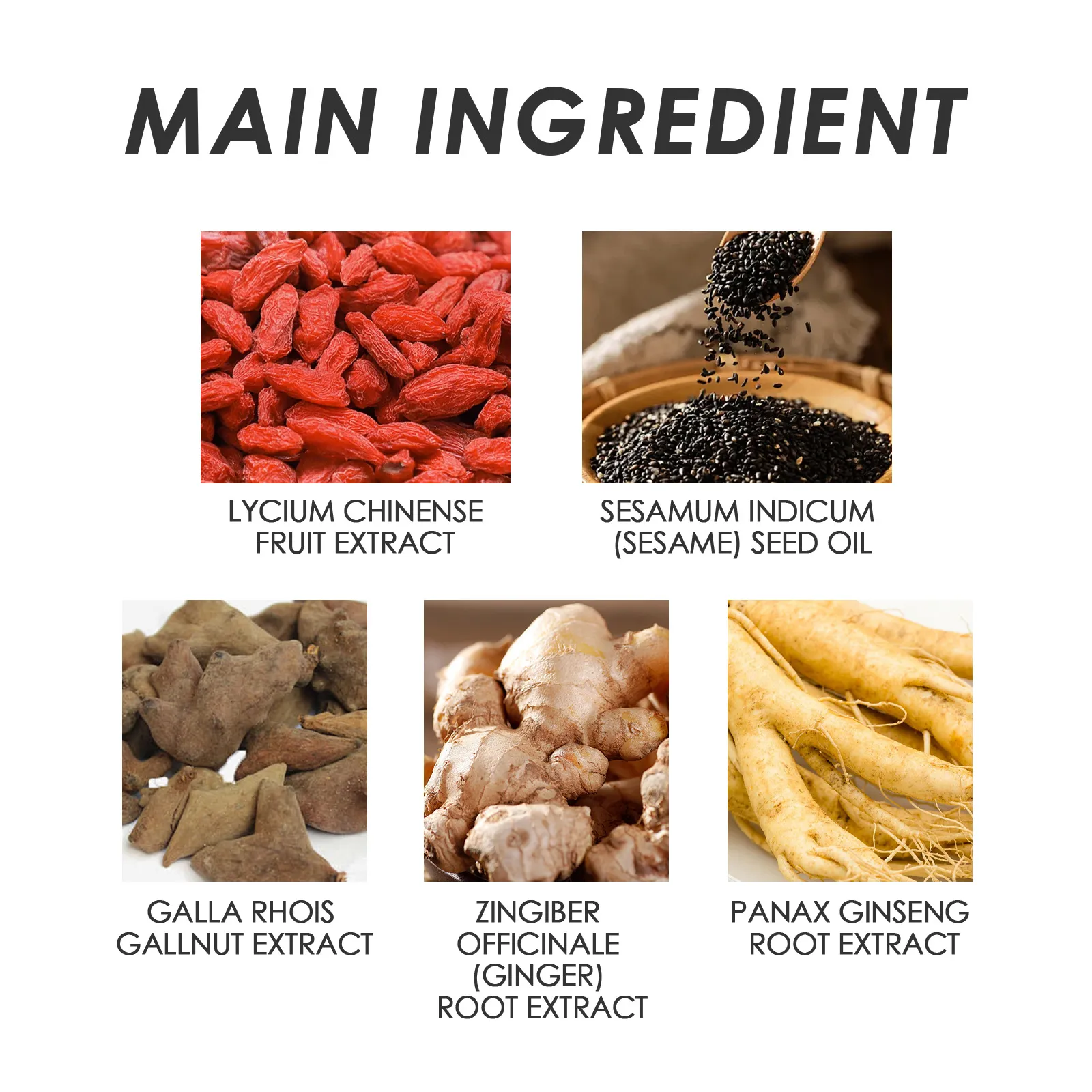 Ingredients: Medlar extract, sesame seed oil, Galla extract, ginger extract, ginseng extract