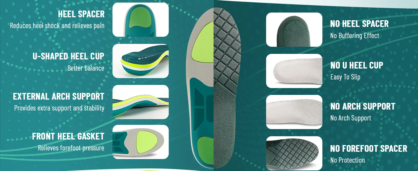 U-shaped Deep Heel Cup: The ultra-high arch support and deep heel cup structural support maintain vertical and balanced foot bones with maximum cushioning, providing stability and helping natural shock absorption. Arch support eliminates and minimizes stress on the foot. It keeps the bones of the foot vertical and increases stability. Arch supports and heel supports can increase support and stability and help reduce heel and arch pain.