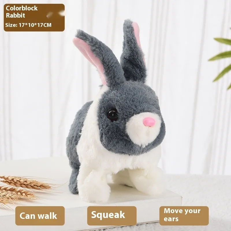 This plush rabbit is equipped with an electric walking mechanism that allows it to move forward as it walks, making it look like a real