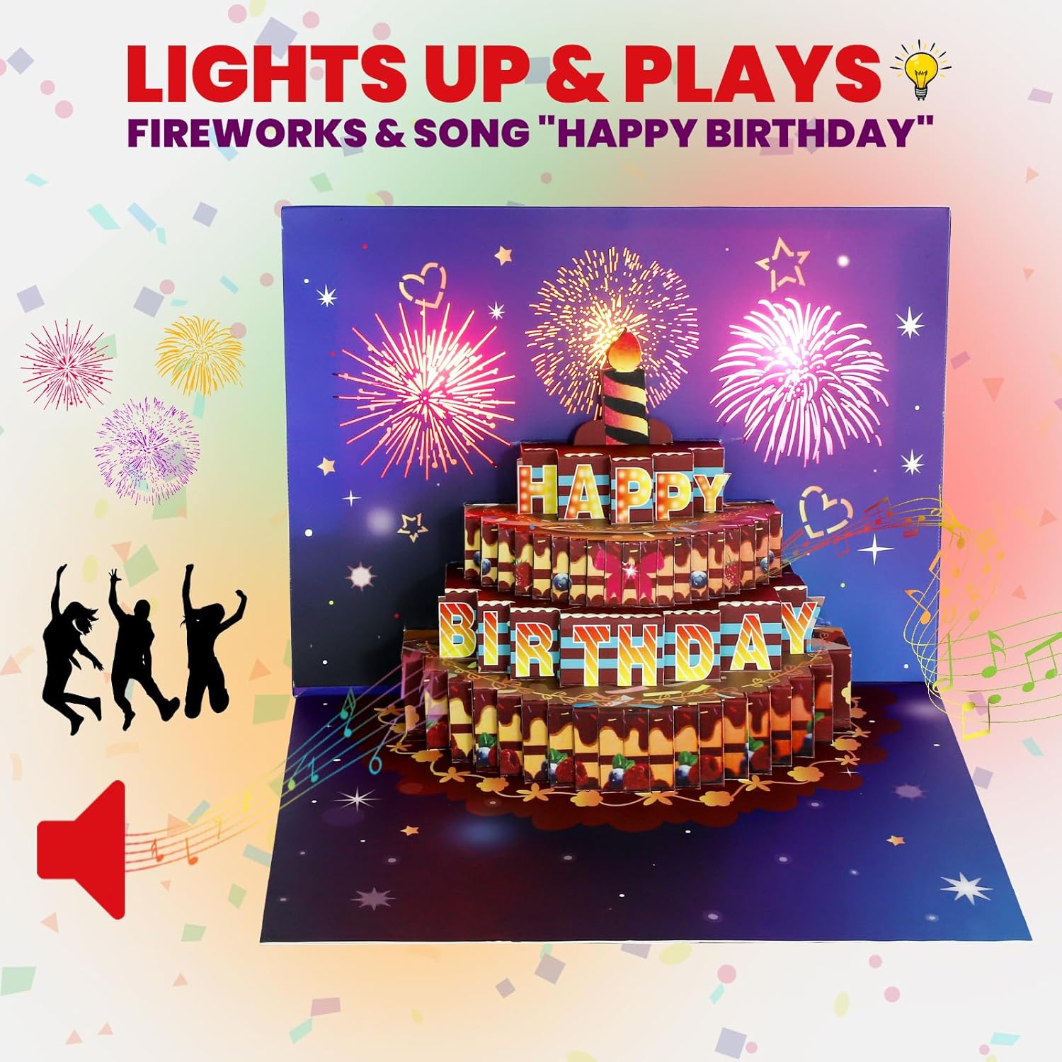 - Our stunning pop-up birthday cards feature advanced audio and lighting technology, adding luxury and magic to your greeting. The vibrant lights and synchronized music create a birthday ritual that's unforgettable.